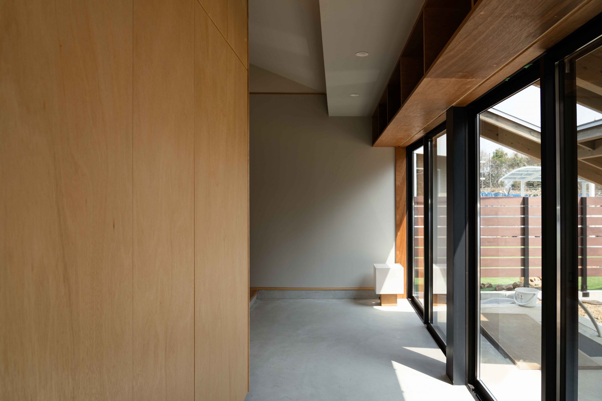 LDKには大屋根のかかったボリュームの中に小さな空間をはめ込み、ただ天井が高いだけの空間が続くのではなく、高低差のメリハリをつける事でそれぞれのエリアでリズムを出し、単一な印象を受けない様な構成とした。